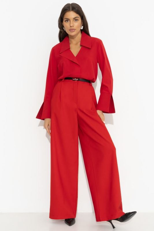 Брюки-палаццо красные с карманами от компании Charutti. Модель широкого кроя, высокая посадка на талии, выполнена из костюмной ткани "пикачу". Пояс классический со шлевками, на пуговице и молнии. Идеальный выбор для городских модниц. Ремень из экокожи в комплект не входит, продается отдельно.