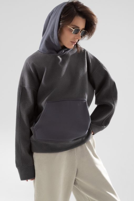 Худи серый с карманом-кенгуру от компании Charutti. Модель с капюшоном свободного кроя. Комбинация двух видов материала. Линия плеча спущена. Идеальный выбор на каждый день.