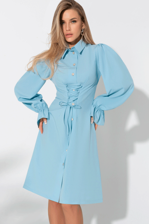 Красивое женское платье от бренда Charutti. Модель свободного силуэта, выполнена из ткани "софт" голубого цвета. Отложной воротник-стойка. Втачные длинные рукава на резинке и защипами по окату. Центральная застёжка на петли и пуговицы. По переду завязки. Стильный вариант для встречи с подругами.
