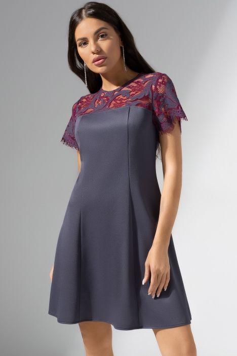 Платье мини серое с кружевом от компании Charutti. Модель полуприлегающего силуэта, выполнена из трикотаж «диор». Круглый вырез горловины. Застёжка на миниатюрную пуговицу по спинке. Короткие втачные рукава. Это Ваш отличный образ, в котором вы всегда чувствуете себя уверенно.