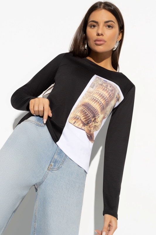 Свитшот трикотажный с принтом от компании Charutti. Модель прямого силуэта, круглый вырез горловины. Длинные втачные рукава. Выполнен из полотна "милано" чёрного цвета. Прекрасное решение для создания стильного образа.
