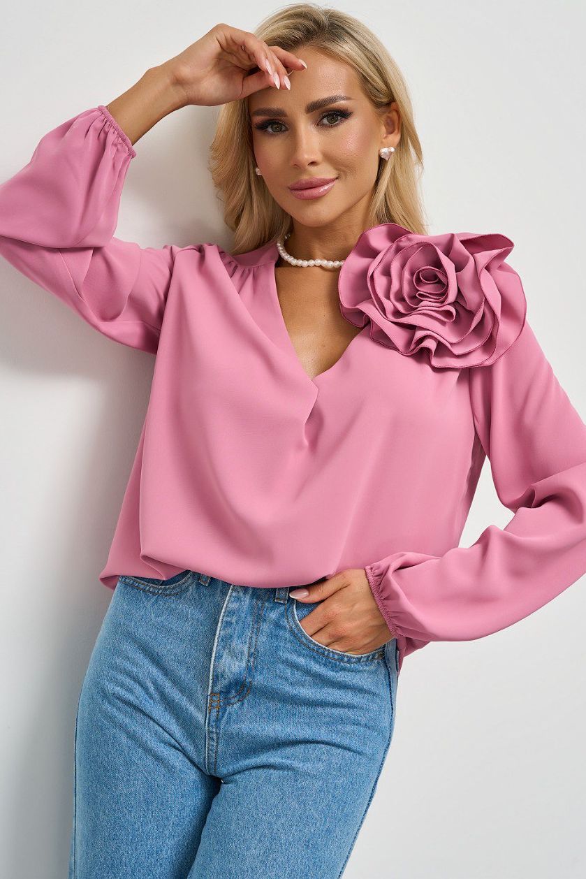 Блузка розовая с объёмным цветком от компании Jetty. Модель свободного силуэта, выполнена из блузочной ткани. V-образный вырез горловины. Втачные длинные рукава с резинкой. Без застёжки и подклада. Прекрасный образ для создания женственного образа. Декоративный элемент роза отстегивается - можно носить как с розой, так и без неё.
