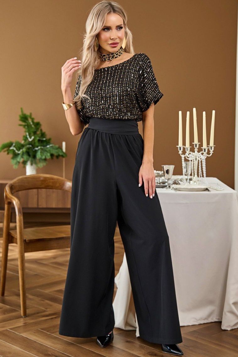 Комбинезон нарядный чёрный с поясом от производителя Jetty. Модель с коротким цельнокроенным рукавом. Верх выполнен из трикотажа с пайетками. Низ изделия из плательной ткани. Изделие отрезное по линии талии, на внутренней резине. Брюки широкие.