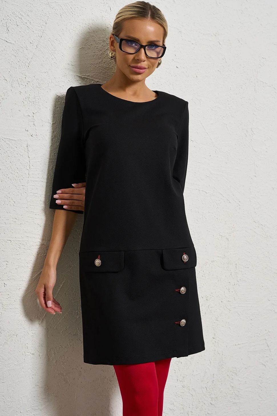 Платье чёрное из плотного трикотажа от производителя Jetty. Модель прямого силуэта, горловина оформлена круглым вырезом. Втачные короткие рукава. По нижней части платья клапаны с декоративными пуговицами и разрез. Идеальный выбор на каждый день.