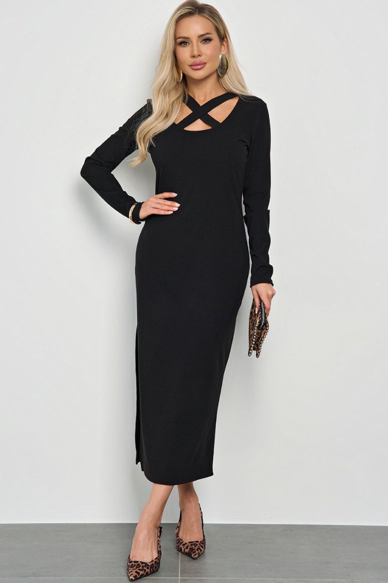 Платье трикотажное чёрное с разрезом от производителя Jetty. Модель полуприлегающего силуэта. Длинные втачные рукава. Круглый вырез декорирован вставками из основной ткани.