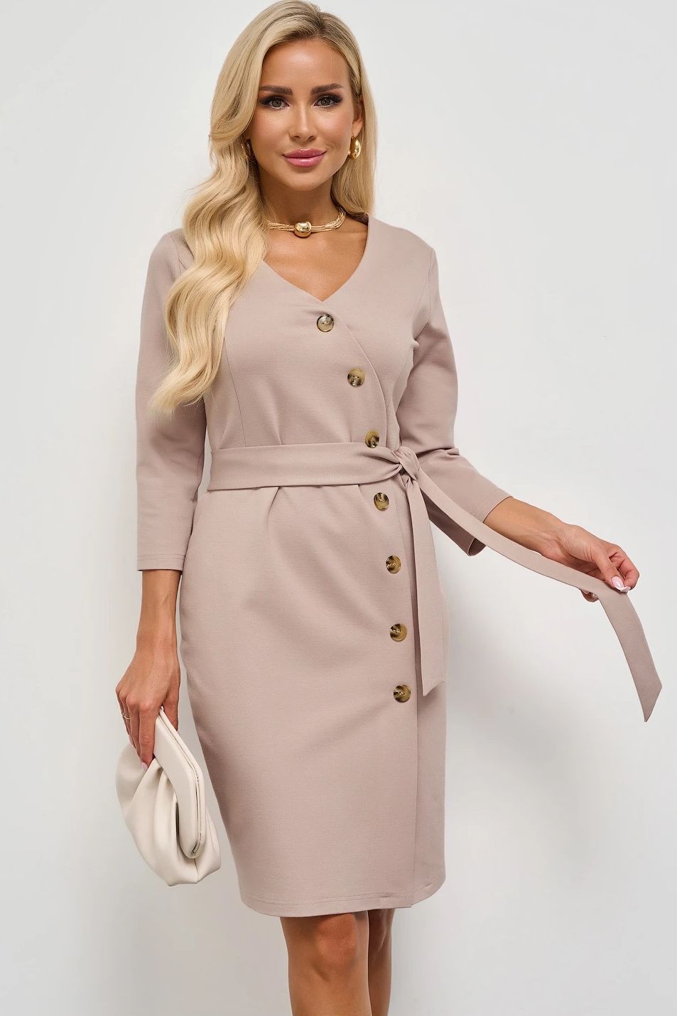 Платье трикотажное с поясом в бежевом цвете от производителя Jetty. Модель с имитацией запаха по переду. V-образный вырез горловины. По переду изделия пришиты декоративные пуговицы. Спереди разрез. Рукава 3/4. Талия отрезная. Спинка со средним швом. Прекрасно дополнит Ваш гардероб для любого мероприятия.