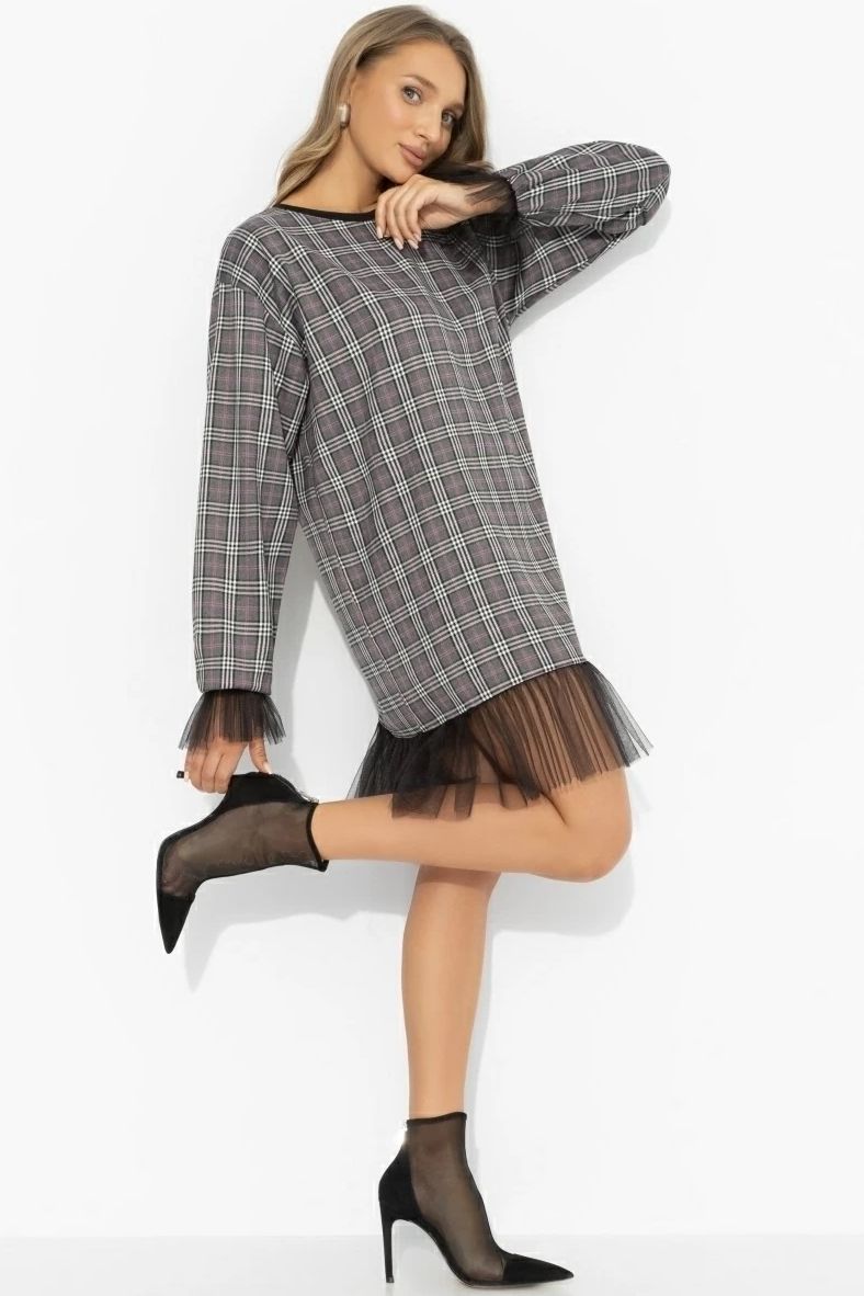 Платье серое в клетку с сеткой по низу
