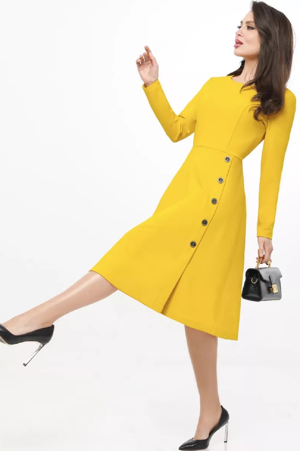 Платье трикотажное с декоративными пуговицами от бренда SelenaSonata. Модель расширенного к низу силуэта, в жёлтом оттенке. Округлый вырез горловины. Рукава втачные, длинные. Застёжка по спинке на навесную петлю и пуговицу. Отрезное по линии талии. Привлекательная модель на любой случай. Рекомендуется бережная стирка при 30 градусах.