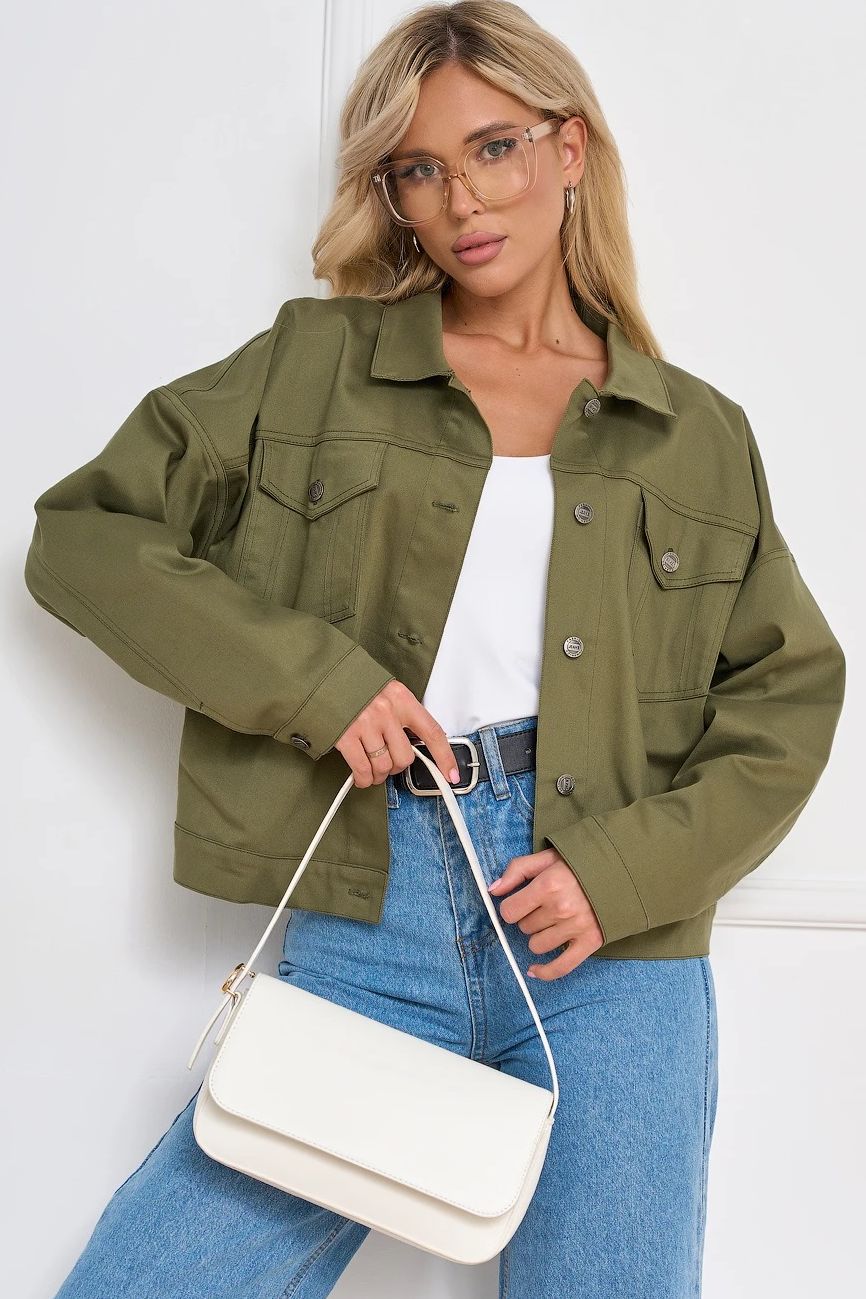 Куртка джинсовая цвета хаки от компании Jetty. Модель прямого силуэта, выполнена из джинсового полотна. Куртка с отложным воротником. Длинный двухшовный рукав с манжетой и застежкой на пуговицу, линия плеча спущена. По переду - накладные карманы с клапаном. Низ с притачным поясом. Прекрасный выбор для создания модного образа.