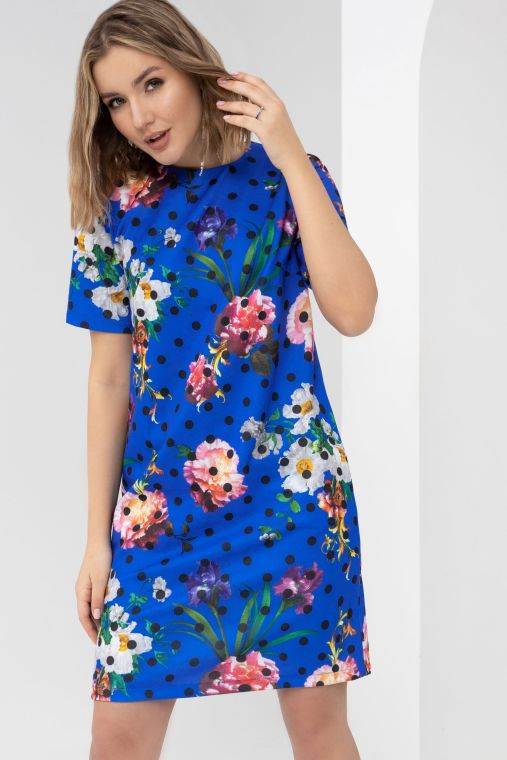 Симпатичное женское платье от компании Charutti. Модель свободного силуэта, выполнена из вискозного полотна "хэви принт" в синем цвете с принтом. Круглый вырез горловины. Втачные короткие рукава. Идеальный выбор для создания яркого образа.