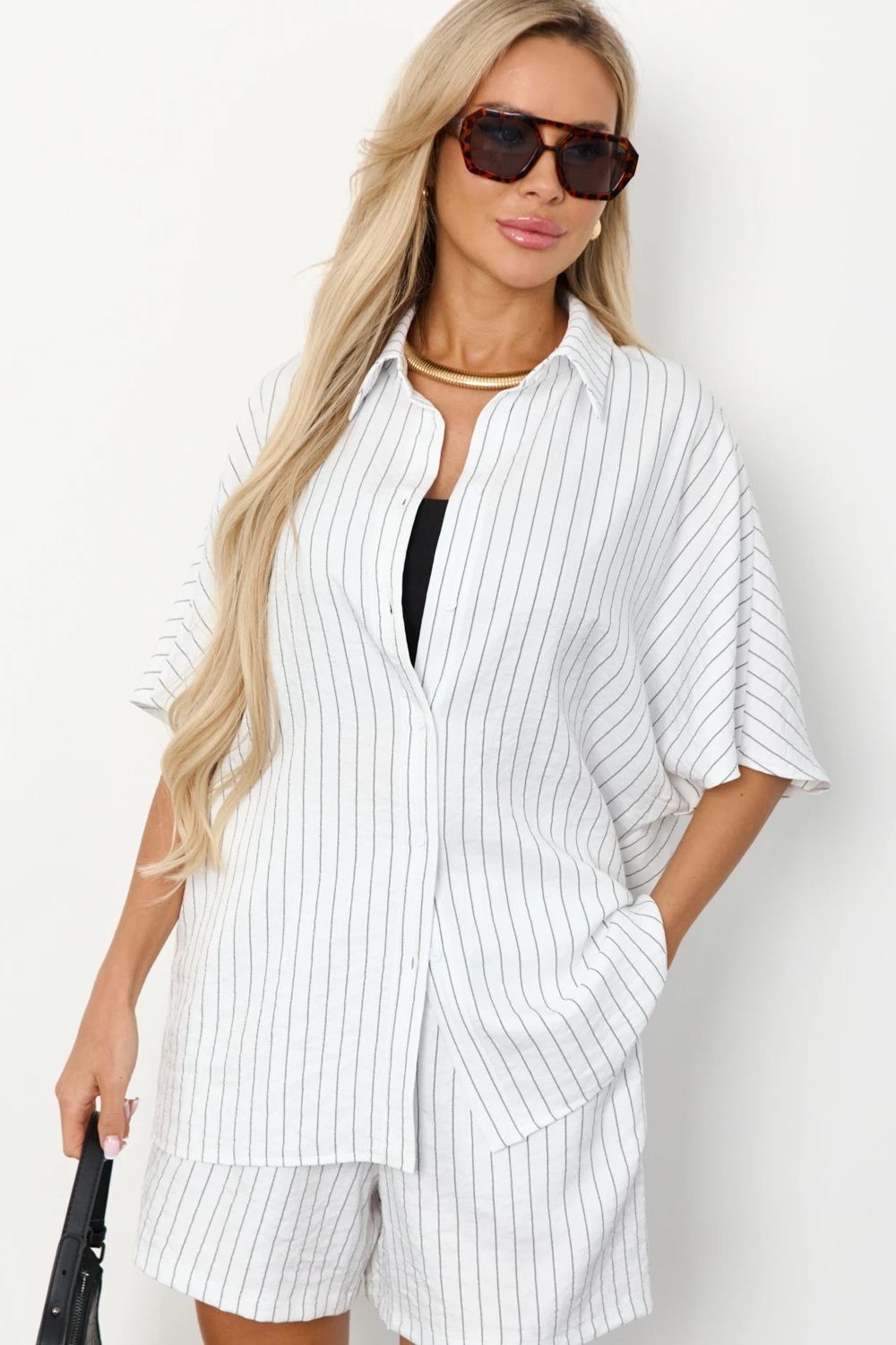Рубашка белая в полоску от компании Jetty, выполнена из лёгкого костюмного полотна. Модель прямого силуэта, отложной воротник-стойка. Застёжка на петли и пуговицы. Рукава короткие. Идеальное решение для создания стильного образа.