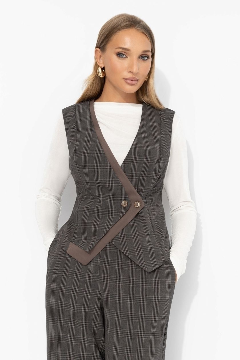 Жилет приталенный в клетку от компании Charutti, выполнен из костюмного полотна. Акцентный крой изделия. Жилет застегивается на пуговицу. Хорошо смотрится в качестве второго слоя. Без подклада. Прекрасное решение для создания стильного образа.