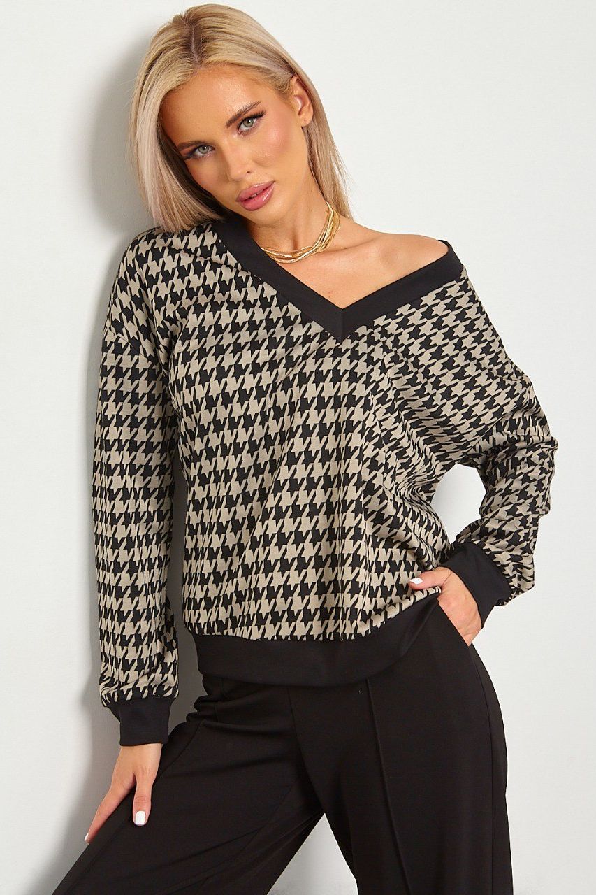 Джемпер трикотажный чёрно-бежевый от компании Jetty. Горловина оформлена V-образным вырезом. Длинный рукав на манжете. По низу изделия широкий притачной пояс. Идеальный выбор на каждый день.