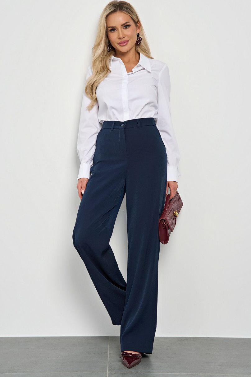 Брюки прямые тёмно-синие с карманами от бренда Jetty, выполнены из костюмной ткани. Притачной пояс оснащен петлями для ремня. По переду застёжка на молнию и пуговицу. Отличный выбор для повседневной носки. Ремень в комплект не входит, продается отдельно.