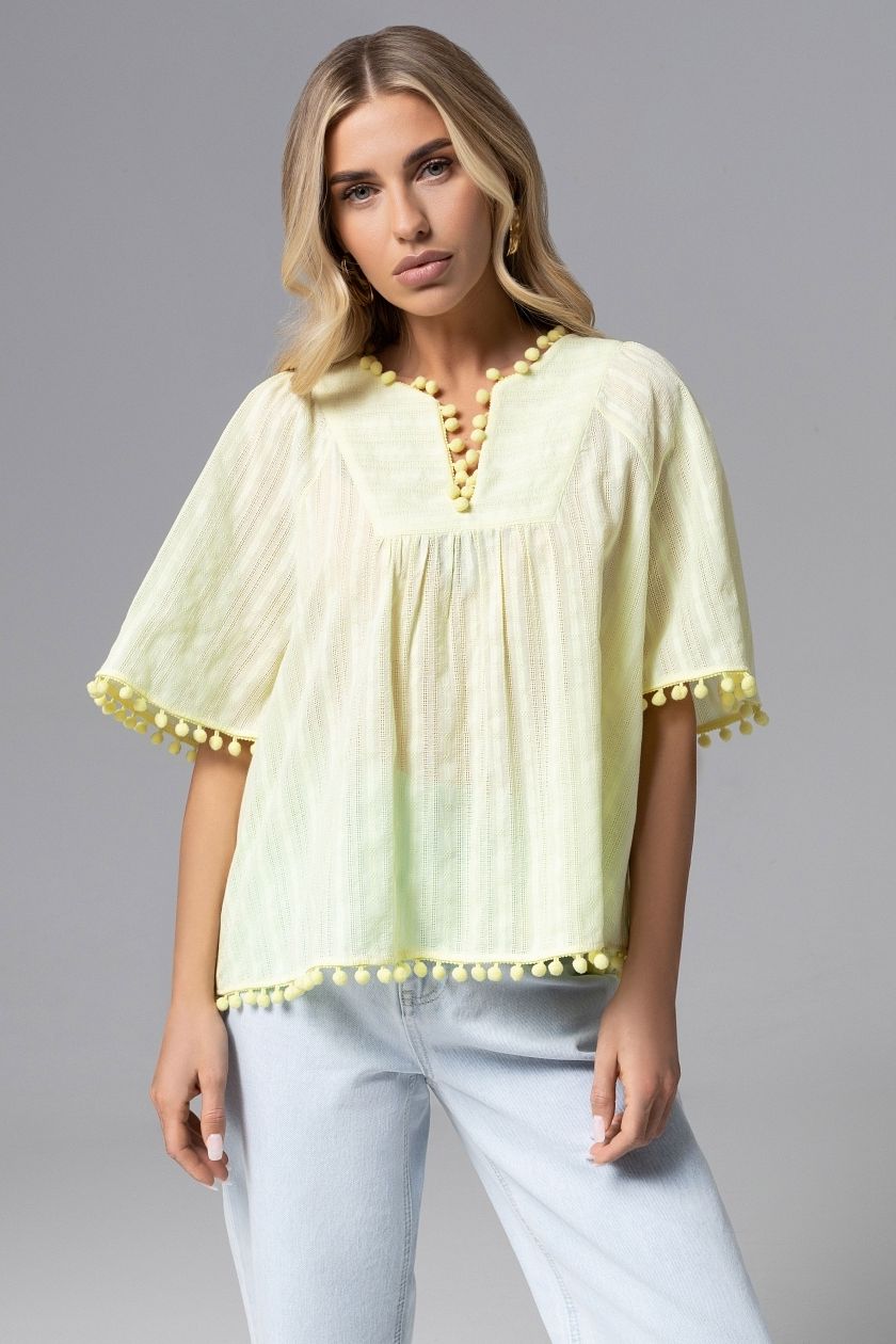 Блузка жёлтая в стиле бохо от компании Charutti. Модель свободного кроя из 100% хлопка. Хорошо смотрится на любом типе фигуры. Круглый вырез горловины переходит в Vобразный разрез. Короткие рукава. Деликатная сборка по передней части изделия. Идеальный выбор для создания романтичного образа.