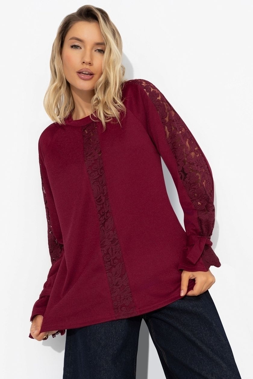 Свитшот трикотажный бордовый со вставками из кружева от компании Charutti. Модель свободного силуэта, выполнена из полотна "кристи", круглый вырез горловины. Длинные рукава с завязками. Прекрасное решение для создания стильного образа.