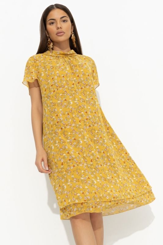 Платье жёлтое шифоновое с цветочным принтом от компании Charutti. Модель свободного фасона, круглый вырез горловины дополнен небольшой стойкой. Короткий втачной рукав. Спинка с застёжкой на завязки. Эффектный образ на каждый день.