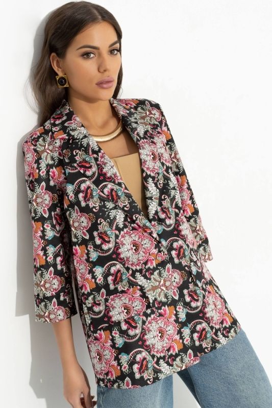 Жакет чёрный с подплечниками от компании Charutti. Модель прямого силуэта, выполнена из ткани «Коттон сатин набивной». V-образный вырез горловины с английским воротником. Втачные рукава с отворотами по низу. Широкая линия плеча. Центральная застёжка на пуговицы. С клапанами. Без подклада. Идеальный выбор для создания женственного образа.