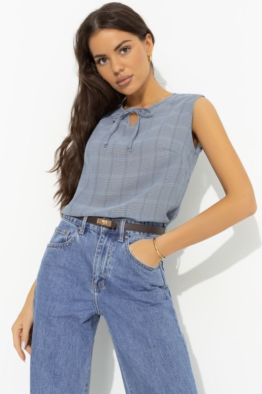 Блузка серая без рукавов от компании Charutti. Модель прямого силуэта, выполнена из блузочной ткани "клетка. Круглый вырез горловины с разрезом-капелька и завязками. Без рукавов. Низ ровный, без разрезов. Отличный выбор для создания эффектного образа.