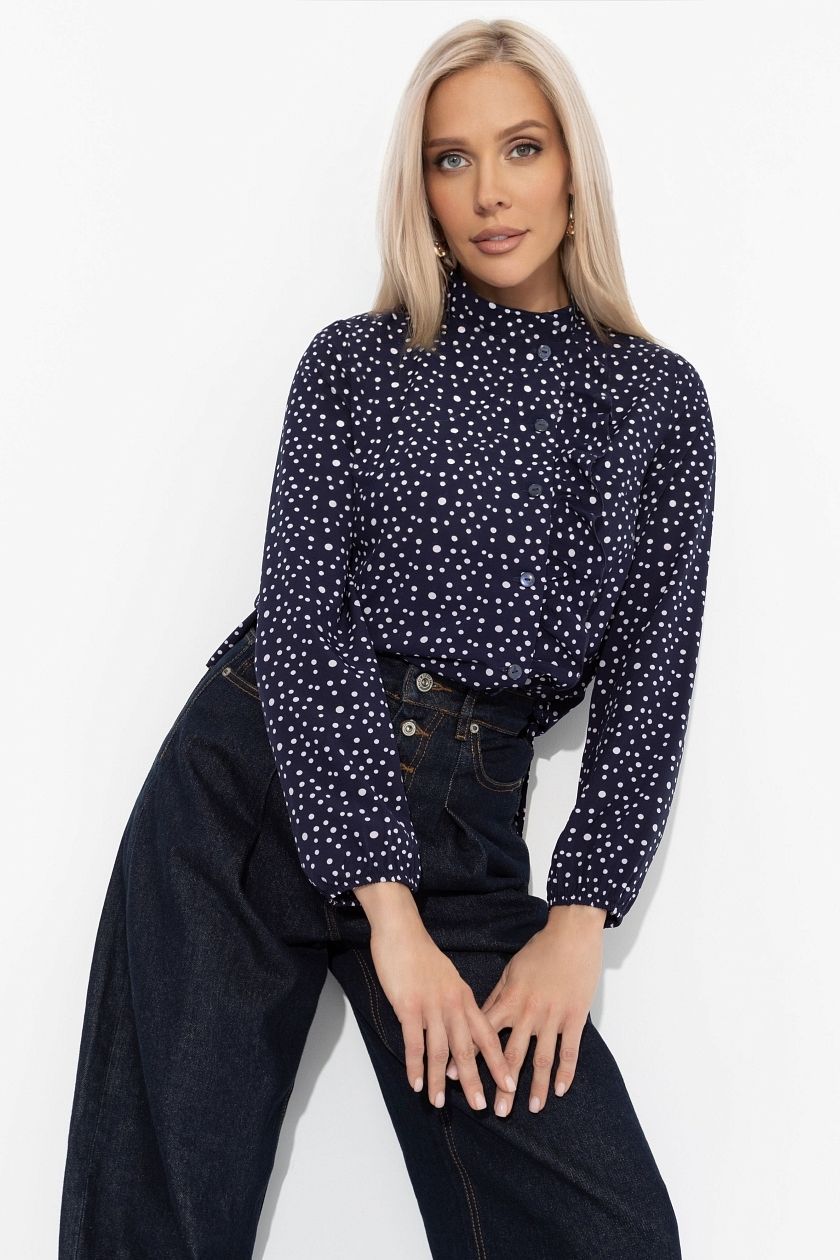 Блузка тёмно-синяя в горошек с воланом от компании Charutti. Модель прямого силуэта, выполнена из блузочной ткани "ниагара". Воротник-стойка. Есть декоративная сборка по линии пуговиц. Изделие хорошо смотрится в заправленном виде и навыпуск. Отличный выбор для похода в гости.
