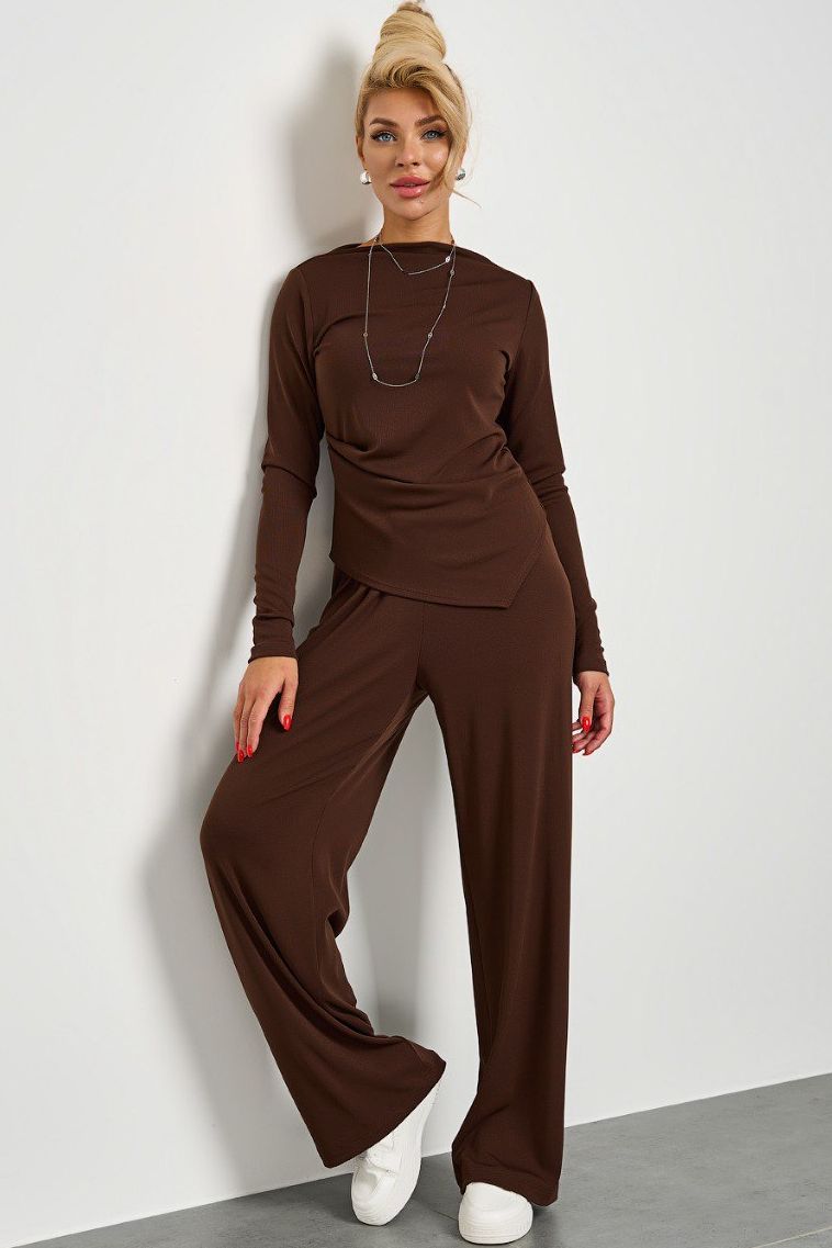 Брюки широкие трикотажные шоколадного цвета от компании Jetty. Притачной пояс на резинке. Без застёжек, карманов и подклада. Отличный выбор для создания стильного образа.