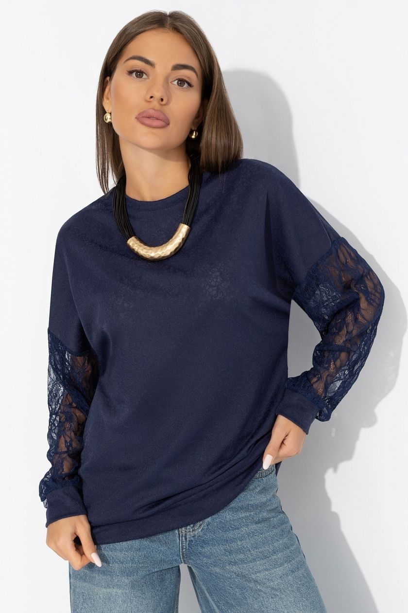 Свитшот синий с рукавами из кружевом от компании Charutti. Модель прямого кроя, выполнена из трикотажного полотна "жаккард". Круглый вырез горловины. Рукава длинные, линия плеча спущена. Идеальный выбор для Вашего повседневного гардероба.