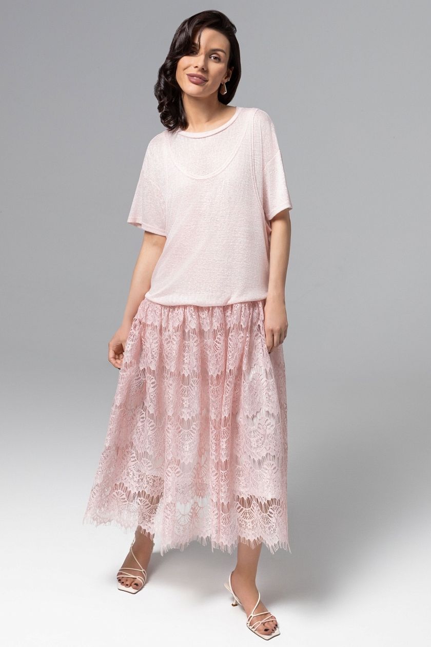 Платье розовое комбинированное с кружевом от компании Charutti. Модель полуприлегающего силуэта. Круглый вырез горловины. Многослойный верх –имитация сочетания майки и футболки. Акцентный крой спинки. Есть подклад.Прекрасный вариант для торжественного мероприятия.
