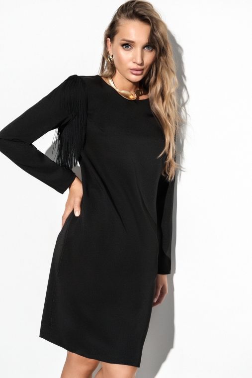 Чёрное платье с бахромой на рукавах от компании Charutti. Модель прямого силуэта, выполнена из костюмного полотна "пикачу". Круглый вырез горловины. Втачные длинные рукава. По бокам удобные карманы. Идеальный выбор для создания неповторимого образа.