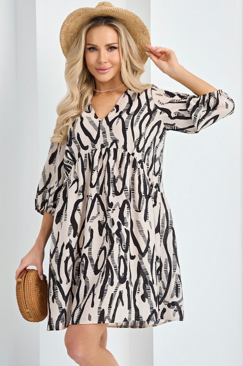 Платье А-силуэта бежевое с завязками по спинке от компании Jetty. Модель выполнена из хлопковой ткани с принтом. V-образный вырез горловины по переду и спинке. Втачные рукава длиной 3/4 на резинке. Отрезное под грудь. Идеальный выбор для создания женственного образа.