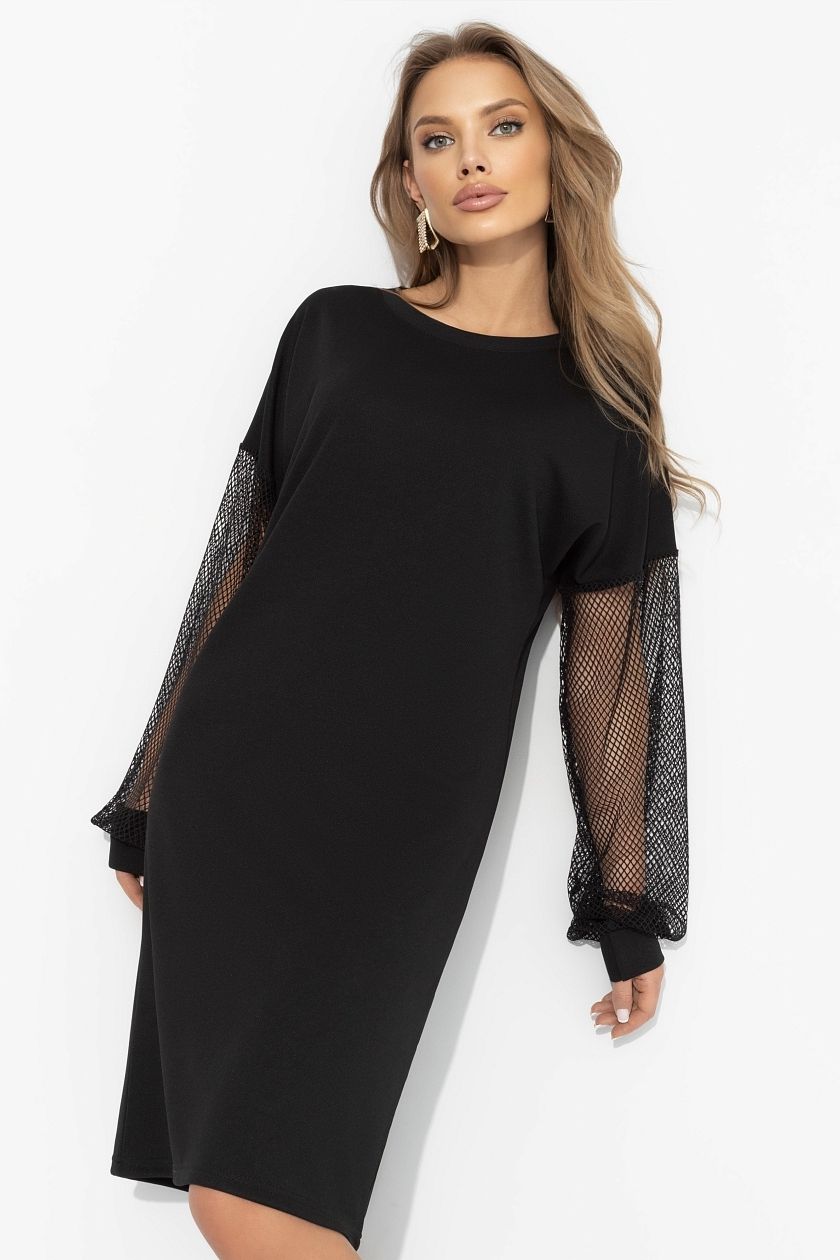 Платье чёрное с с акцентными рукавами от компании Charutti. Платье из плотного трикотажа, свободные рукава из мягкой сетки для эффекта обольстительной интриги. Очень комфортное: прямой крой, универсальнаая посадка, не просвечивает. Подойдет на любой тип фигуры.