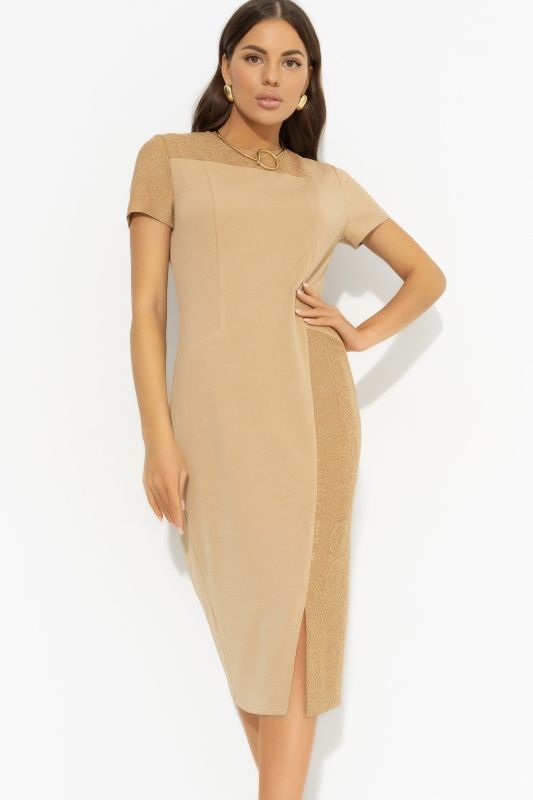Платье-футляр трикотажное бежевое от компании Charutti. Модель прилегающего силуэта, выполнена из «креп», кружево на подкладе. Горловина оформлена круглым вырезом. Короткие втачные рукава. Миниатюрная застежка-пуговица по спинке изделия. По переду небольшой разрез. Это Ваш отличный образ, в котором вы всегда чувствуете себя уверенно.