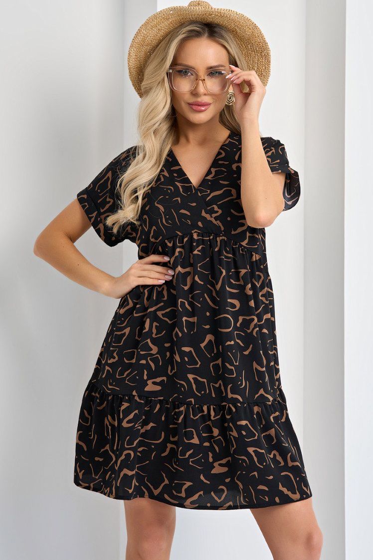 Платье короткое чёрное с воланом от компании Jetty. Модель свободного силуэта из выполнена из плательной ткани с принтом. V-образный вырез горловины с запахом. Отрезное под линией груди. Короткие рукава с отворотом. Идеальный выбор для создания женственного образа.