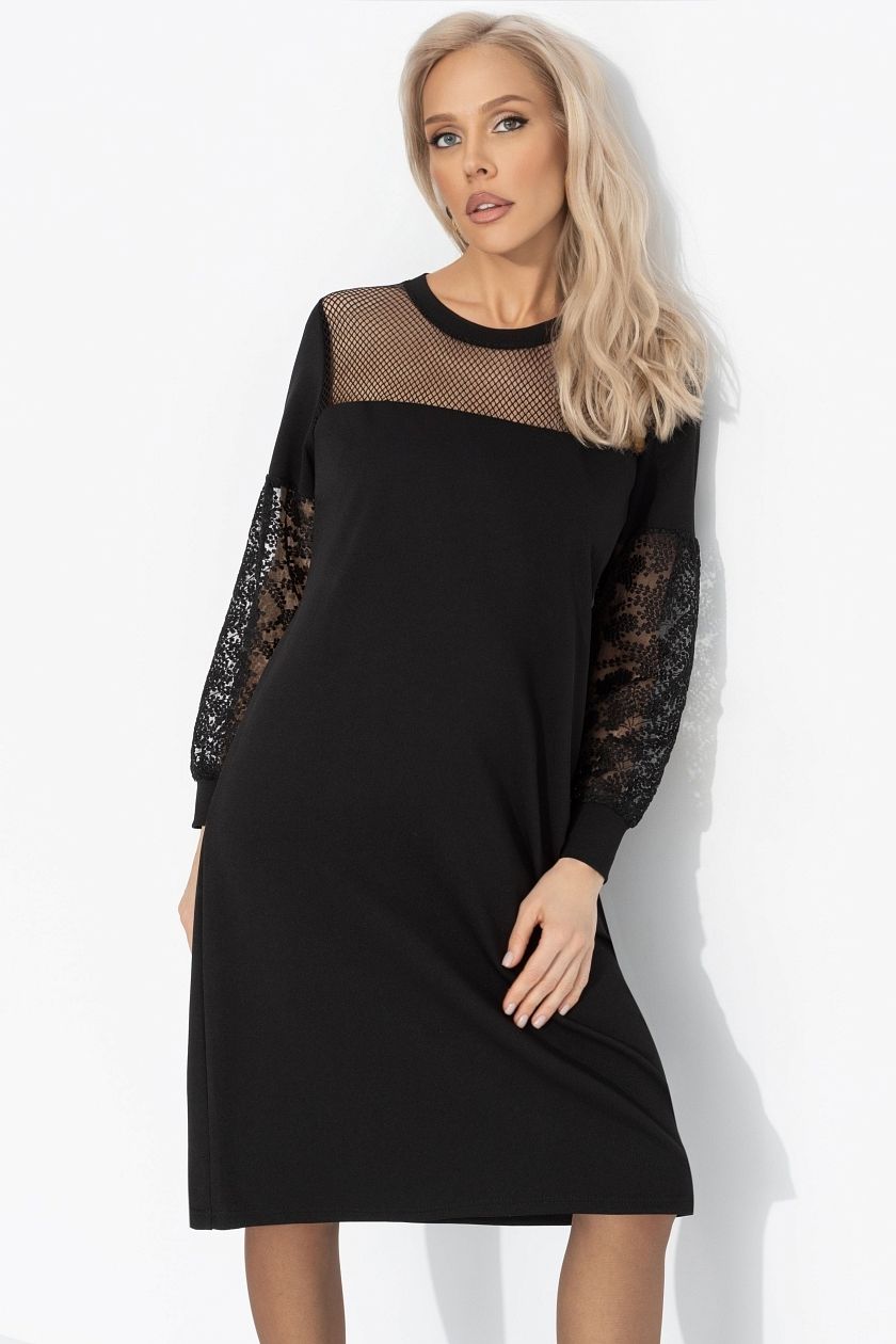 Платье миди чёрное прямое от компании Charutti, выполнено из трикотажного полотна "диор". Круглый вырез горловины. Полупрозрачная вставка из сетки и рукава из гипюра-стрейч создают изящный контраст фактур. Без застёжки. Это Ваш отличный образ, в котором вы всегда чувствуете себя уверенно.