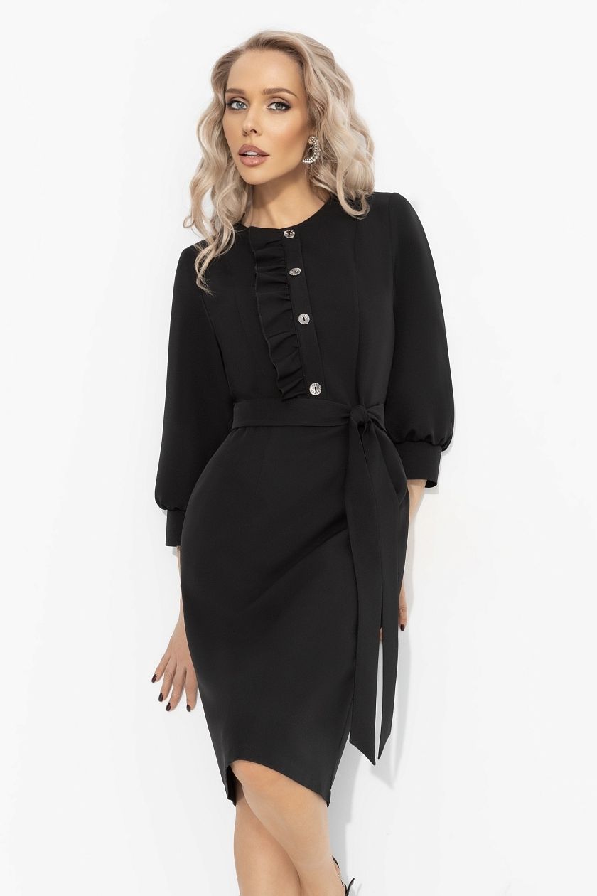 Платье чёрное с рюшами от компании Charutti, выполнено из костюмного полотна с рюшами. Полуприлегающий силуэт платья со съемным поясом подчеркивает талию и визуально стройнит. Рукав 3/4 на мягкой манжете, застежка на декоративные пуговицы. Вертикальная рюша по центру вытягивает силуэт.