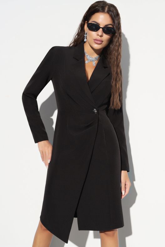 Платье однотонное чёрное на запах от компании Charutti. Модель полуприлегающего силуэта, выполнена из костюмной ткани "барби". V-образный вырез горловины с английским воротником. Втачные длинные рукава. Застёжка на пуговицу. Идеальный выбор для офисных модниц.