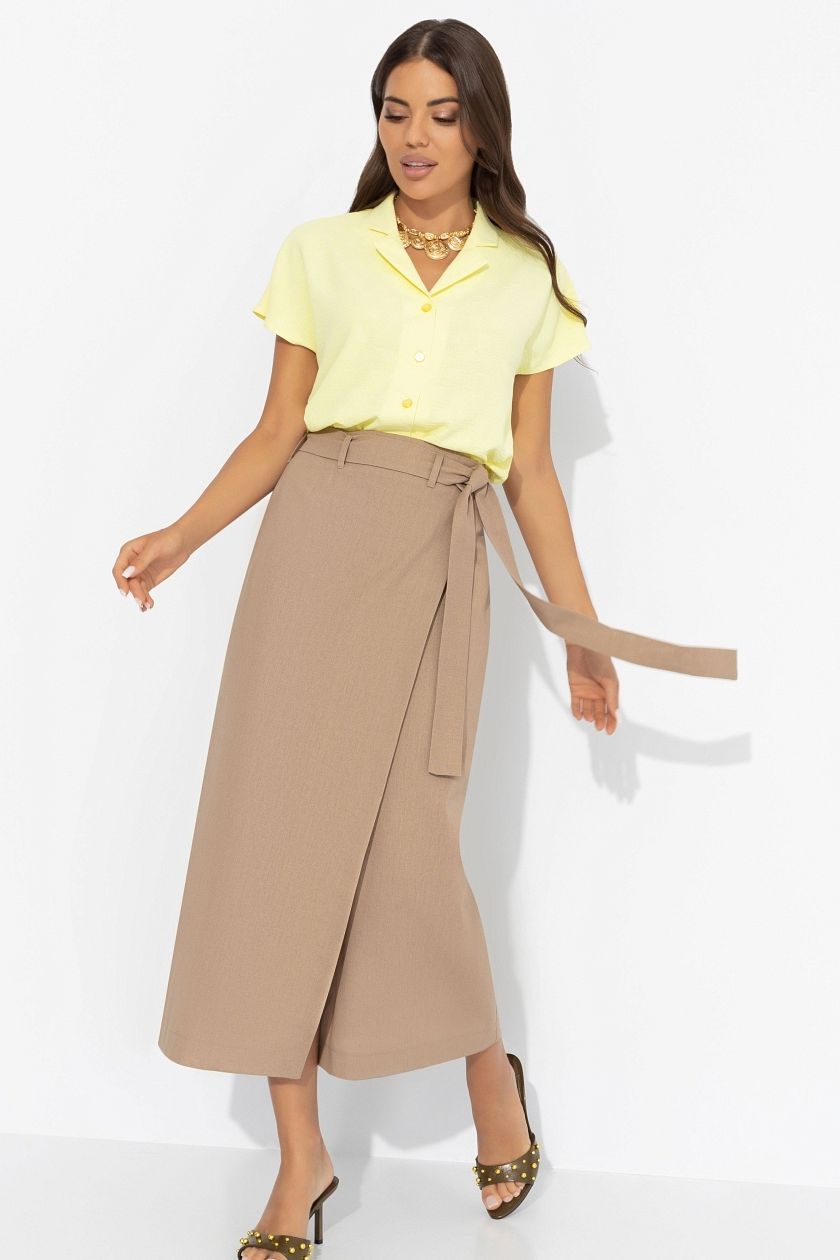 Юбка бежевая на запах от компании Charutti, выполнена из льна. Застегивается в нахлёст на пуговицы. Есть глубокий разрез. Изделие со шлевками. Пояс в тон изделия в комплекте. Этот универсальный элемент одежды легко сочетается с различными блузками и топами, позволяя создавать как повседневные, так и более торжественные образы.