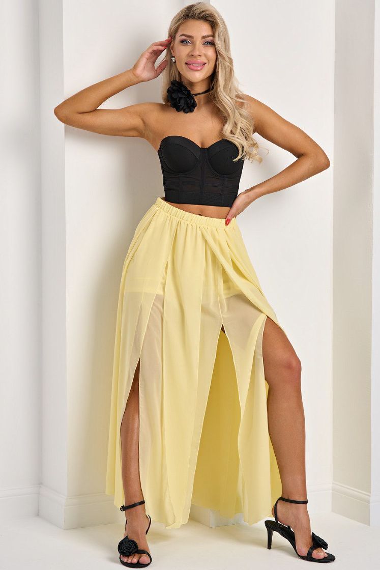 Юбка жёлтая макси из шифона от компании Jetty. Модель расклешённого силуэта, двойная ткань + шортики. В боковых швах и по переду изделия разрезы. Пояс на резинке. Идеальный выбор для городских модниц.