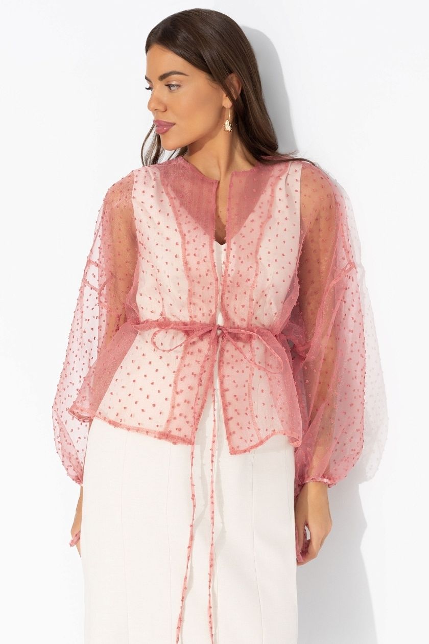 Жакет нарядный розовый из органзы от компании Charutti. Свободный укороченный. Пояс на тонких завязках. Спущена линия рукава. Рукав оформлен длинными завязками. Идеальный выбор для создания стильного образа.