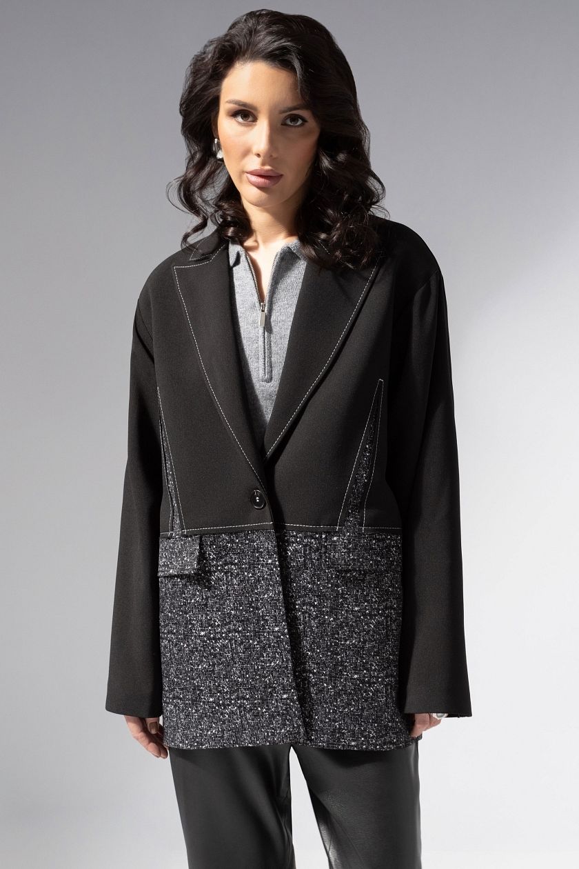 Жакет с контрастными швами от компании Charutti. Комбинированный жакет из двух видов костюмной ткани «пикачо», костюм. флак, «плат кагзи».Чёткая линия плеч, свободный силуэт, застёжка на одну пуговицу. Есть подклад контрастного цвета. Идеальный вариант под любой наряд - супер-находка для современных леди.